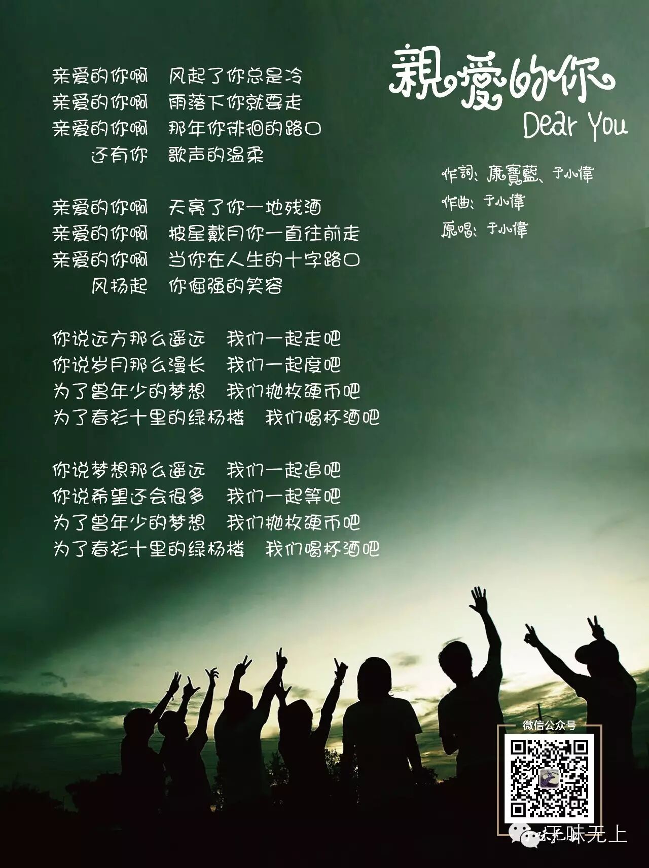 17岁的雨季,回忆起童年的点点滴滴,却发现成长已慢慢接近。十七岁的我们,左手拿着青春,右手握着明天,但我们不敢用左手去赌右手,因为我们玩不起!十七岁的我们也曾伤心流泪,也曾黯然心碎,在静静地成长历程中我们体会到了成长的烦恼,开始感受越长大越孤单的无奈,一个人的孤单旅行,我们走的很缓慢。谈起十七岁,你的回忆中是怎么样的片段呢?这首《亲爱的你》是小伟创作给17岁的年华,一首《醉鄞江》把我们引入了一个如诗如画的佳境,那么这首《亲爱的你》又会给我们怎么样的感觉呢?8月18日于小伟全新创作单曲《亲爱的你》QQ音乐清新上线!下面一起随着民谣风的旋律来感受下17岁追梦的那个少年的心路历程!