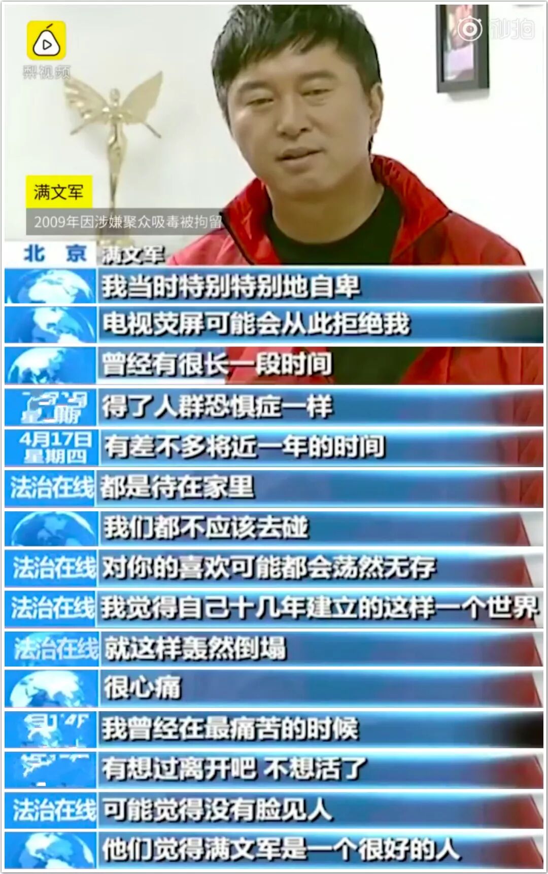 当年满文军的一首《懂你》,唱响了大江南北,满文军身上所散发出的沉稳低调的气质也让他圈粉无数,大家不仅喜欢他的歌也喜欢他的人,然而没有想到的是,2009年满文军因涉嫌聚众吸毒而被拘留,他在网友心中的高大形象也瞬间轰塌。后来他在采访中说,那时他特别特别自卑,他知道作为一个公众人物,这样做影响了太多的人,曾经有很长一段时间他好像得了人群恐惧症,不敢去面对有人的地方,觉得特别没脸见人,曾经在他最痛苦的时候,他想到过死。但是出事之后,他几乎再没有去过夜场,生活恢复了简单,只有音乐和运动。