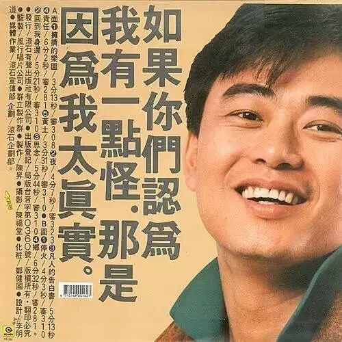 幸亏后来是滚石张培仁签下了他,还写了「假如你觉得我有一点怪,那是因为我太真实」这两句经典文案,让陈升没当成「歌星」,变成了不大一样的「歌手」,如此一路怪怪地真实到现在,夫人想来也早就见怪不怪了。