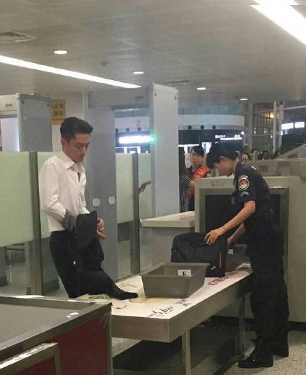 李易峰过安检的时候姿势很放松。
