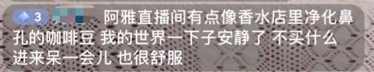 还有粉丝留言:“阿雅直播间有点像香水店里净化鼻孔的咖啡豆,让世界一下子安静了,哪怕不买什么,进来待一会儿也很舒服。”我看到这条留言的时候,觉得“哇,好开心”。我从不想强迫大家买东西,只要你偶尔来看看,并在看直播的过程中感到放松,我就已经很满足了。