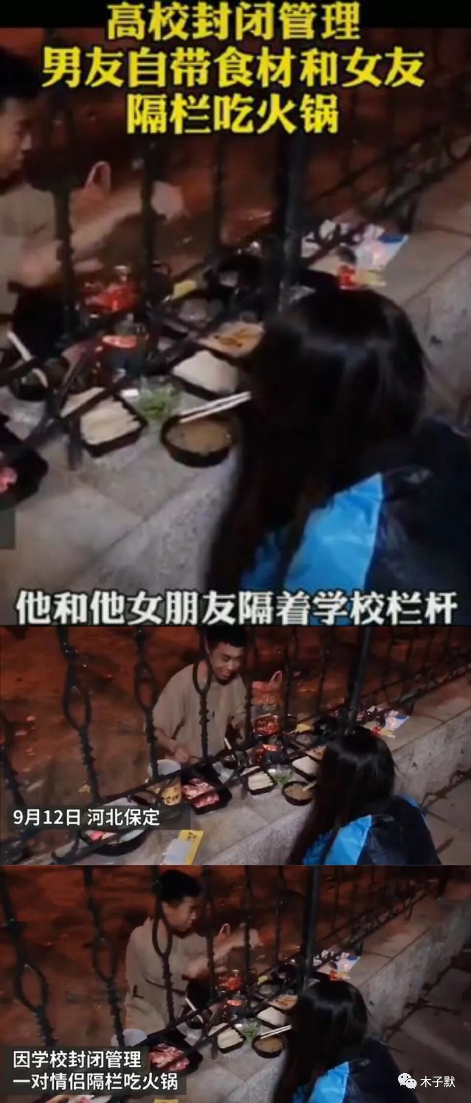 看过一个视频,在河北保定,一所高校实施了封闭管理,一对大学情侣隔着围栏吃起了火锅。