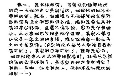 她说到,当知道思诺最后一笑是一个长镜头时,内心是有点崩溃的。当她很好的完成这个镜头后,却发现: