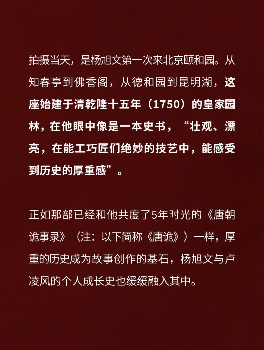 最近,杨旭文依旧是忙着工作。而工作之外的时间,他会大量阅片,也会深入人群,去观察生活里那些鲜活的人。在即将过去的一年里,他印象最深刻的事依旧和《唐诡》有关,那便是:“第三季播出后得到了太多观众的喜爱与支持。”这些都是他继续前行的动力。
