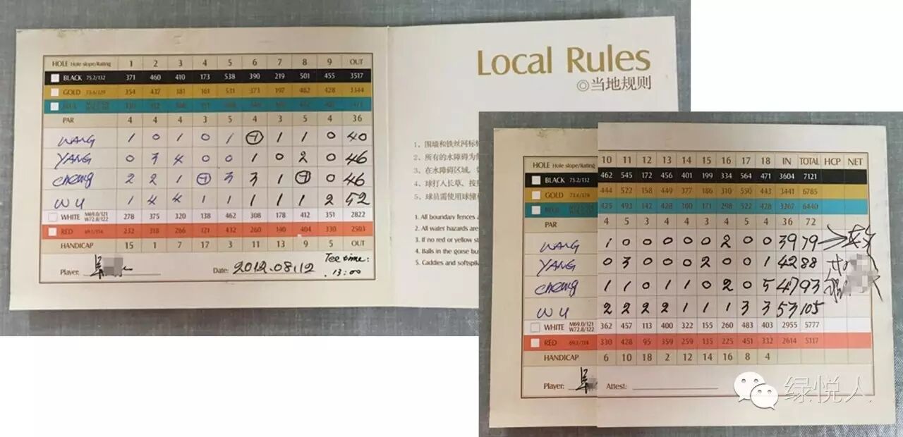 吴:是的,他当年安排这场球,选了我在上海最喜欢的Links球场,他说让我安排一个我最好的球友,他安排一个球友,一组四人,打一场“生日杯”。今天再拿起这张卡,回忆当时的情景,仍体会到他由心而发的友谊和关怀,特别感动。也因为这种鼓励,我当天打了105杆,这个成绩于高手来说不算什么,但于我而言就很不错。按照老王的说法,以我的条件不能以72杆为标准杆,应该以每洞加一杆,也就是90杆作为标准杆。虽然整张球卡没有Par,没有抓鸟,但是发挥稳定,我觉得是高神眷顾的一份生日大礼。
