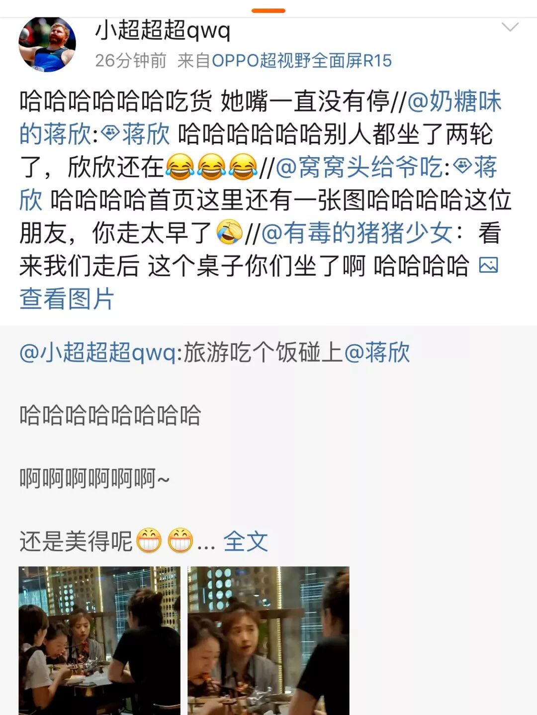 8月23日,网友在火锅店偶遇蒋欣,当时并不见其他明星,据猜测,她应该是在跟工作人员一起用餐。蒋欣身材微胖,全赖吃得多,而网友也表示,蒋欣众人在火锅店很能吃,旁边的桌子已经换了两波客人,蒋欣他们还在那儿吃不停。最好玩的是,那两桌客人都拍下了蒋欣的照片,后来在网上“相遇”才知道坐的是同一张桌子……