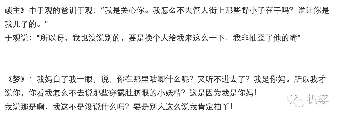 王朔在《顽主》里有过这样一个经典逻辑:《梦里花落知多少》作还抄了王朔的经典对白。“咱们谁管谁叫爸爸?你要叫我爸爸我也给你把尿。”到了郭敬明那里变成了女主角和妈妈拌嘴,把“把尿”替换成了“喂奶”。