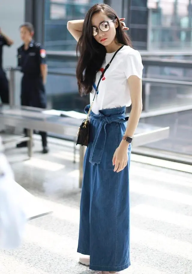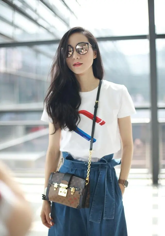 退去舞台光环下穿私服的韩雪,白色半袖衫配牛仔阔腿裤,休闲舒适,