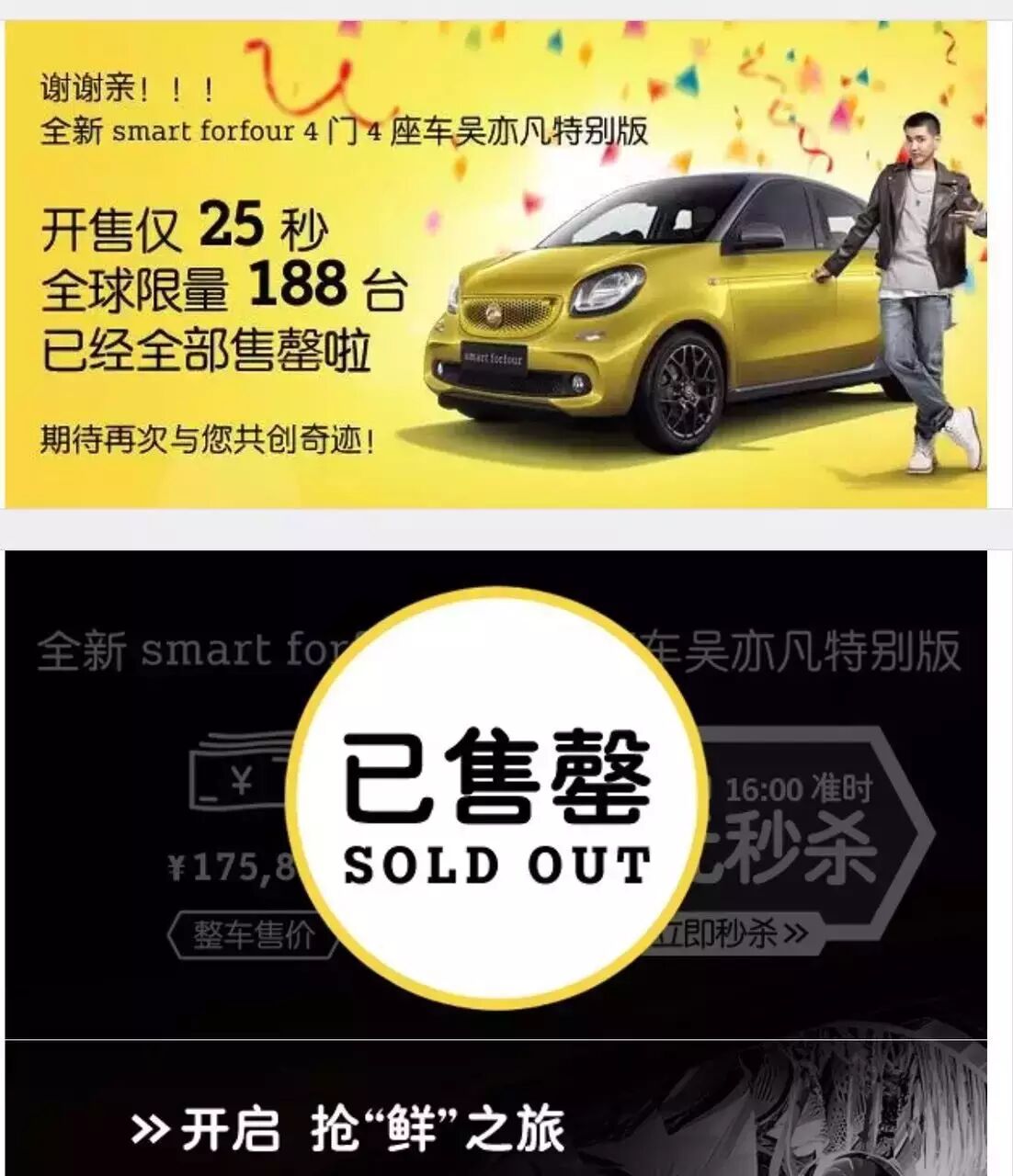 近期Smart奔驰正式宣布吴亦凡成为其首位华人品牌大使,在天猫限量发售4门4座的吴亦凡特别版,并创下25秒售空188台售价175,888元奔驰Smart的传奇纪录,实际售价总额高达3300多万,绝对称得上是汽车营销界的经典案例。