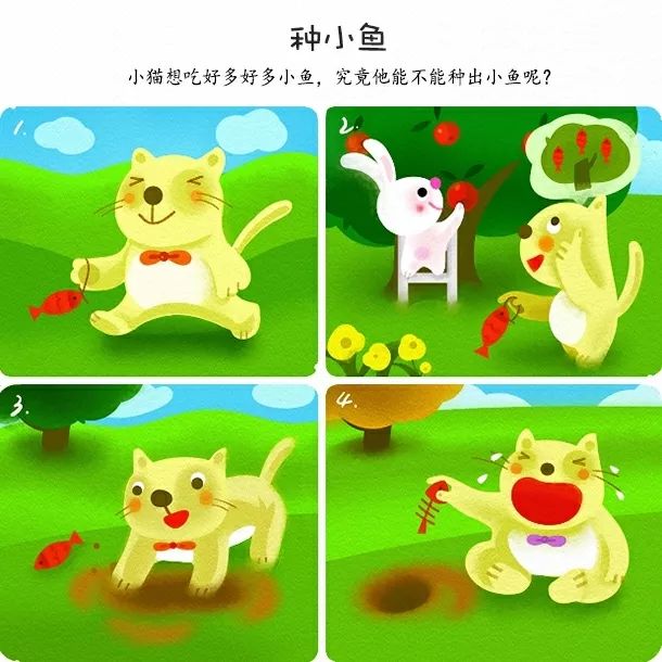 小猫就拿着鱼,很开心的走到哪里,很期待。走到一半,看到了小兔子在摘苹果,小猫就想可以有苹果树,那就有种子可以种苹果树。他就像小鱼,可能也是一个种子可以种到地底下。他就把小鱼放在旁边,用手用力的挖了一个大洞。把小鱼扔进去。