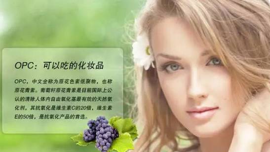 葡萄籽中含有一种叫葡多酚的物质,也称花青素(OPC),具有很强的抗氧化作用。有关研究表明,OPC具有帮助皮肤增强氧气交换的能力、能有效地抵抗皮肤氧化衰老,其抗自由基的氧化功能是维生素C的20倍、维生素E的50倍。