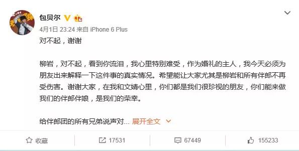 距离柳岩道歉几个小时后,包贝尔发博文道歉:“柳岩,对不起,看到你流泪,我心里特别难受”,“我尊重每一位女性,我与你们一样憎恶那些婚闹,憎恶那些伤风败俗的陋习,然而事态的发展都是我始料未及的,也是任何人都不愿意看到的。”
