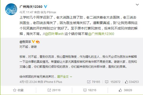 包贝尔还在道歉声明中提到,本来在婚礼前准备了“撕名牌”的游戏,但是因为贴有名牌的衣服被扣在了海关,只能临时修改环节,变成双方对抗下水。包贝尔特别强调了这个主意是自己出的,和他人无关。