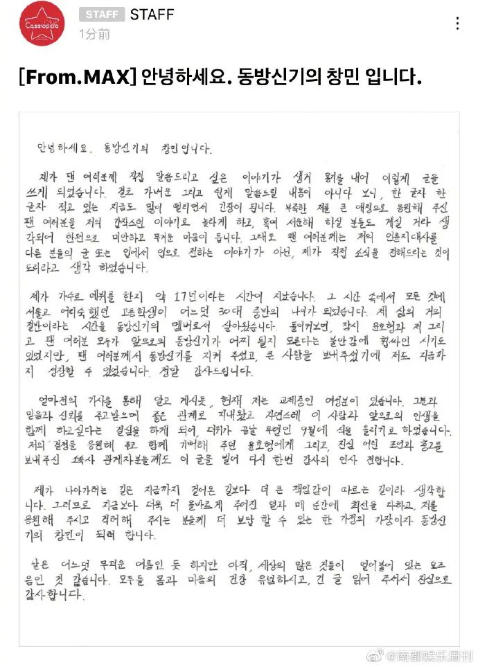 而这封诚恳的手写信也得到了粉丝们的一致好评,整个韩网都是祝福的声音,而且对于他的手写信给予了高度评价,说昌珉这封信写得字迹工整,一看就是用心了。