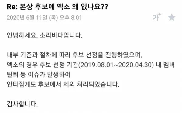 而得到的回答居然是,因为EXO在候补期间(2019.08.01 ~ 2020.04.30),发生了退队争议,所以被踢出去了。