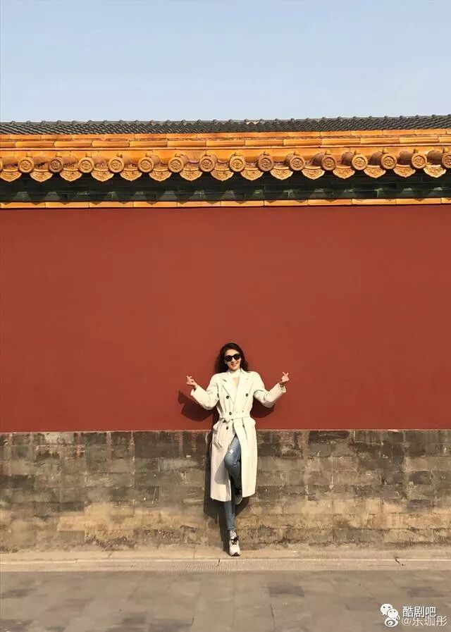 身后大红色的城墙衬得乐珈彤气质更加卓越,一只手做出了一个开心的手势,一双大长腿很是惹眼,完全是气场全开的样子。