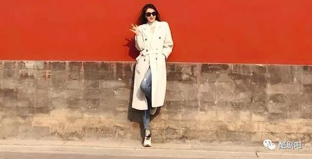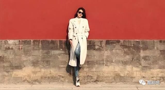 乐珈彤一手插兜,另一只手自然的垂在身侧,脸上戴着墨镜,头微微的向一边偏过去,一只脚放在后面红色的城墙上,露出的皮肤白皙细腻,整个人很像是20多岁小姑娘的状态。