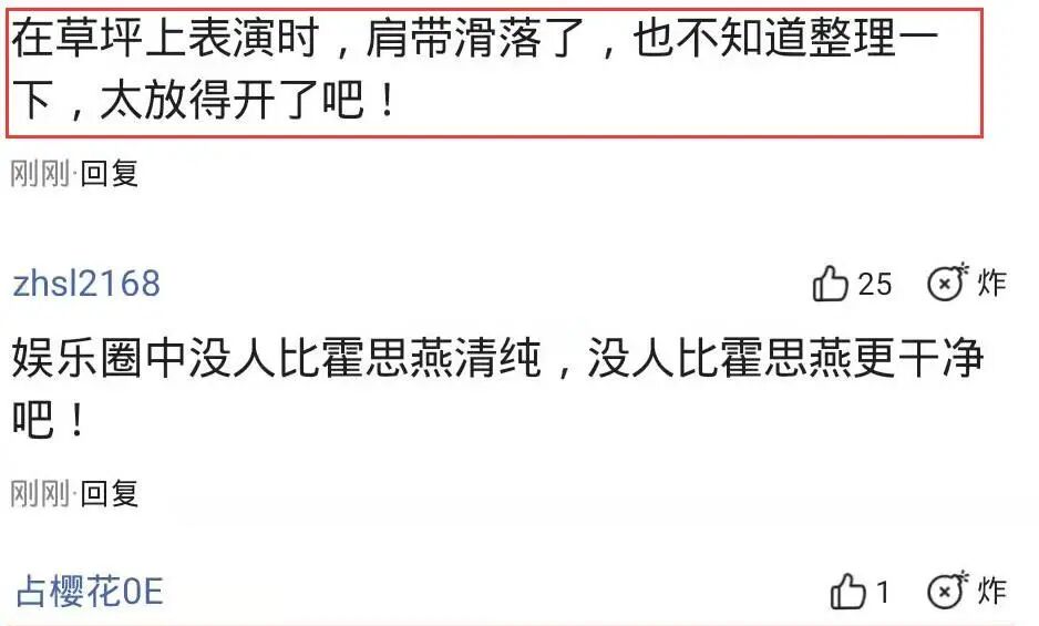 有一位网友在评论区留言,“在草坪上表演时,肩带滑落了,也不知道整理一下,太放得开了吧”,还有一位网友在评论区留言,“请搞清楚,人家是在跳舞,衣服当然会出现这样的问题,形象自然有反差,我觉得霍思燕挺好的”,从这两位网友的评价来看,很显然大家的看法有争议。
