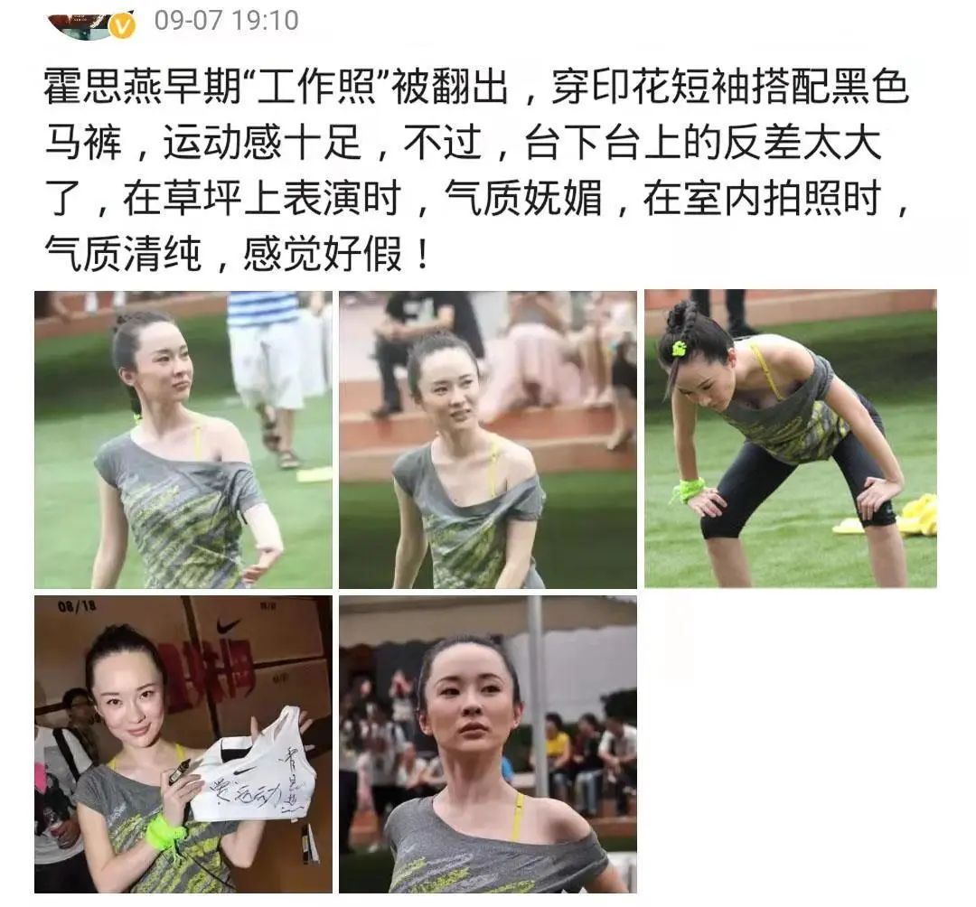 9月7日,有一位网友在网上晒出了五张霍思燕的照片,并配文“霍思燕早期“工作照”被翻出,穿印花短袖搭配黑色马裤,运动感十足,不过,台上台下的反差太大了,在草坪上表演时,气质妩媚,在室内拍照时,气质清纯,感觉好假”,这一组霍思燕早期“工作照”火了,阅读量超过了260万,由此可见,关注霍思燕的人确实不少。