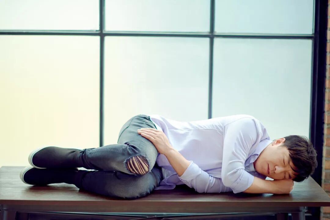 他躺在一张破旧的木桌上,头枕着胳膊,双腿蜷起,闭上了眼。这个动作维持了5秒钟,比别的动作都久一点。