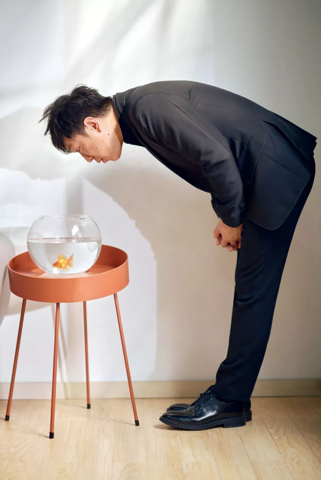 也许他想打个盹儿,但一米开外的相机还在等待着捕捉下一个动作和表情。他睁开眼,按照摄影师的指导,顺从地摆出坚定的、颓废的、面无表情的表情。换下一套衣服的时候,有两件类似的黑西装,工作人员问他喜欢哪件,他看了看,摇摇头说:「不重要。」
