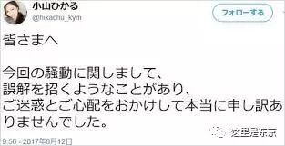 曝光后,此女推特上发文致歉。同样字里行间带着日语惯有的暧昧不明,避开表明此事属性。