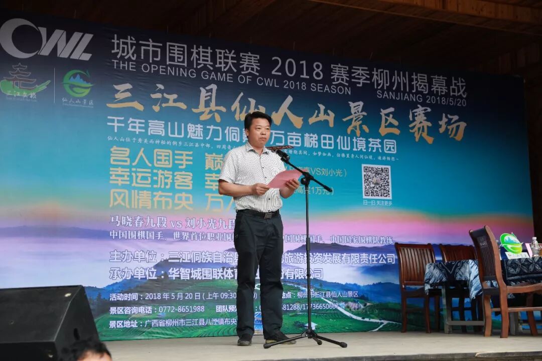 参加本次活动的嘉宾有中国围棋协会副主席、华智城围联体育产业股份公司董事长雷翔,国家围棋队领队华学明七段,柳州市旅发委副主任汤立平,三江县委副书记、县长吴乐,三江县政协主席兰美清,三江县委常委、县委办主任吴志峰,三江县人大副主任陈杏萍,三江县政协副主席、旅游产业组组长吴万清,三江文化旅游投资发展有限责任公司董事长覃扬林,以及职业棋手王洪军七段、谢少博二段。