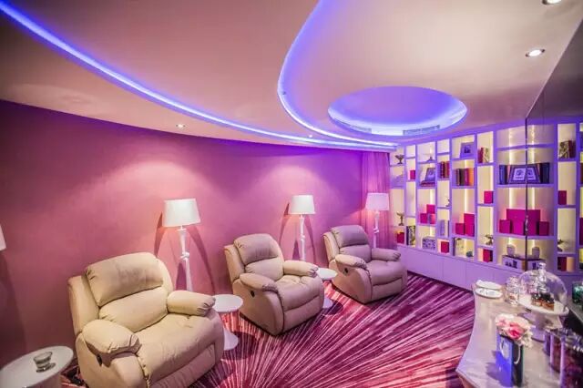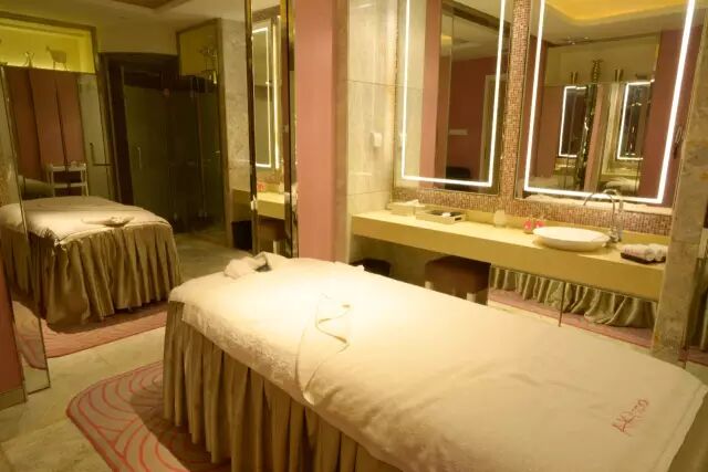 为闺蜜好友准备的按摩房,按摩床采用头对头的方式,方便好友闲聊,不方便时还可以将中间的隔板合上,一房两用,方便地保留私密空间