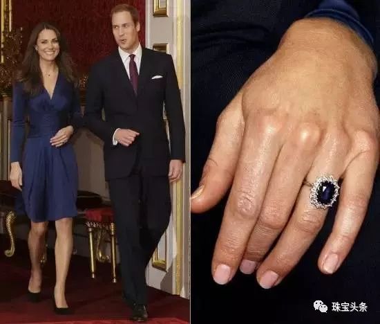 威廉王子跪下来用这款戴安娜王妃曾经戴过的18克拉蓝宝石钻石戒指向她的女友凯特•米德尔顿 (Kate middleton)求婚。