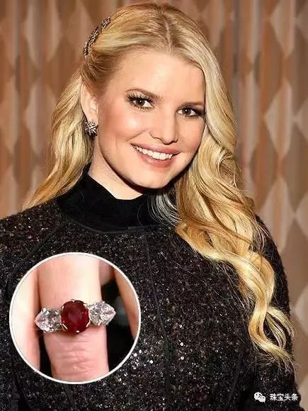 这枚戒指是埃里克•约翰逊(Eric Johnson)送给杰西卡•辛普森(Jessica Simpson), 3克拉的红宝石戒指闪闪夺目。