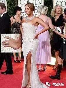 碧昂斯对于男友Jay-Z送给她的钻石戒指非常满意,红毯上的她也不忘随时在镜头前展示这枚幸福指环,据说这枚18克拉的戒指价值高达500万美金。