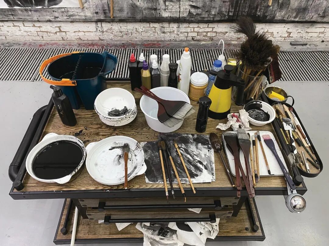 孙浩:我用脸盆和水舀子,拿脸盆是最好的。因为我的画在画砧墙上,立着画的,我就直接往上泼。先把画喷湿了再朝上泼,然后倒墨、倒水,就这样互相冲。