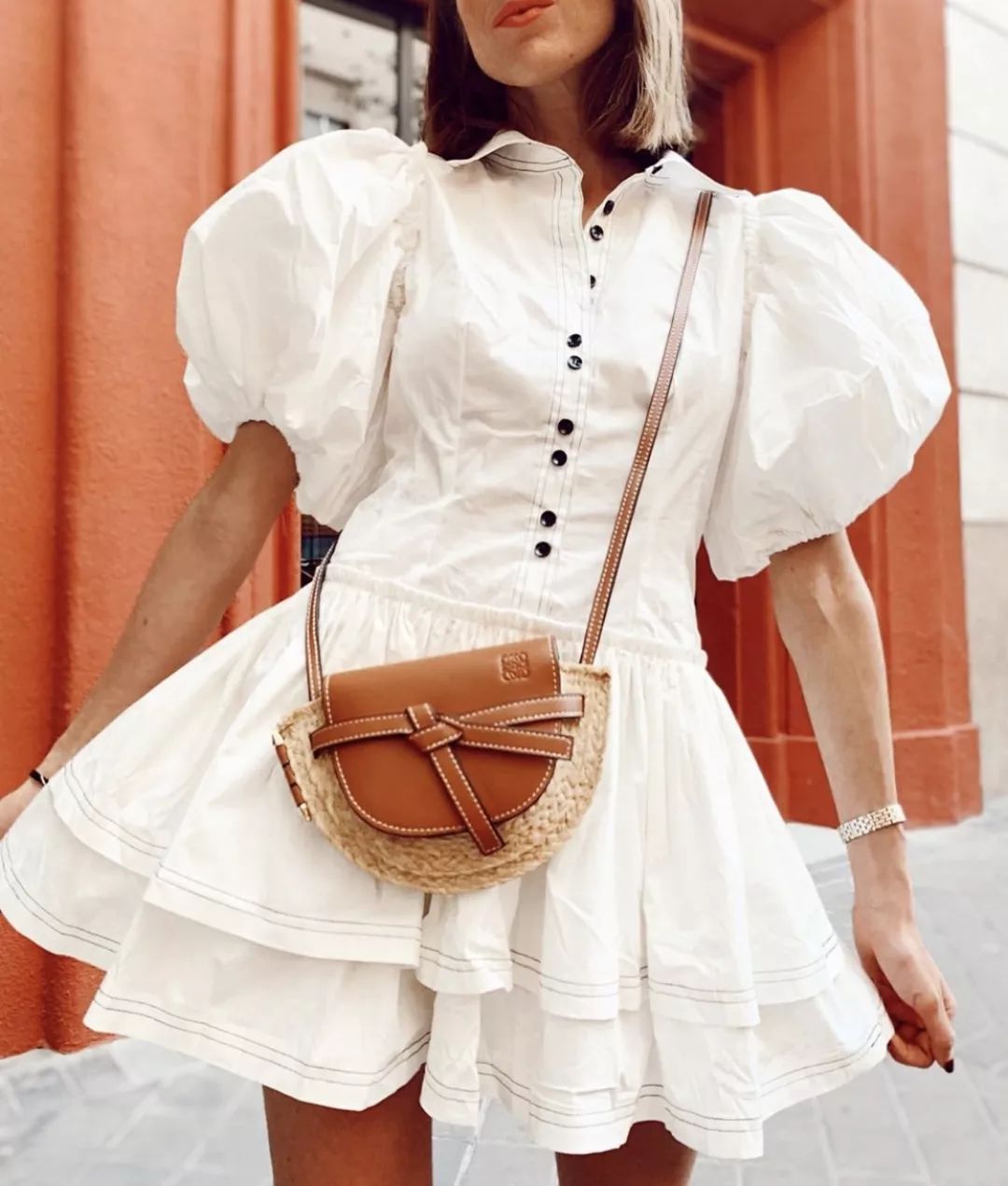 除了穿搭,其实我一眼更是看中了她那天背的小包包,是LOEWE今年秋冬系列的mini Gate,拼接的配色看着很夏天,很有活力。