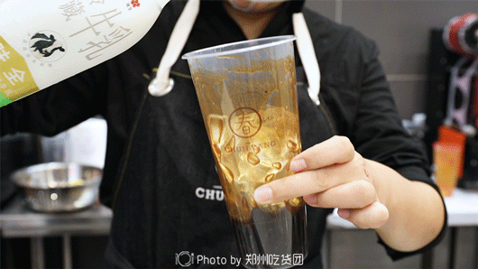 搅一搅,和鲜奶完美融合后,浓醇爽滑的口感,Q弹有嚼劲的珍珠,吸到嘴巴的每一口,都让快乐值蹭蹭地涨!