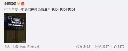 今天,微博上戴娇倩疑似怀孕的照片曝光,图中戴娇倩为某品牌活动站台,身材有些“发福”。随后戴娇倩发微博提到“新的生命”,并发布产检B超图,坐实怀孕消息。