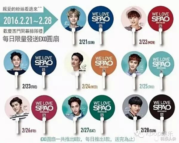 韩国平价时尚品牌SPAO在西门町展店,试营运期间除了以促销商品吸客外,还供有每日500支EXO的扇子,从2月21发到28日,只送不卖。不少EXO的粉丝因此彻夜排队,西门店工作人员表示,前三天最早来排的粉丝都是凌晨陆续出现,但之后越来越夸张,到最后一天甚至有粉丝27日领完直接就地排队,等待24小时候再领下一支EXO的扇子。