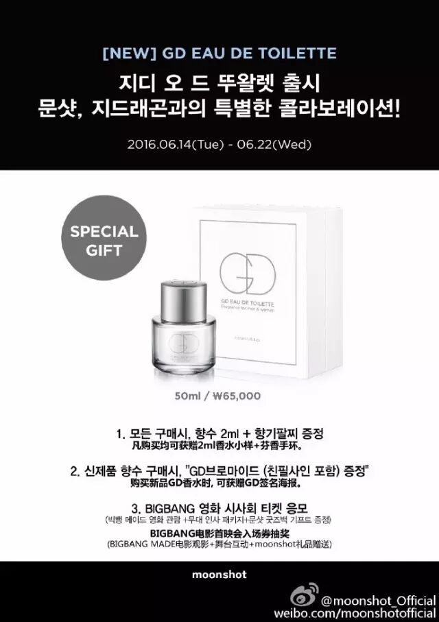 近日moonshot推出新品GD香水,号称GD的味道。虽然国内还不能购买,但VIP们早已蠢蠢欲动。然而主页君认为GD的味道从来不是一瓶香水可以定义的。他的味道存在于他演唱的每首歌中,存在于有关他的所有影像中,存在于所有VIP的心中。
