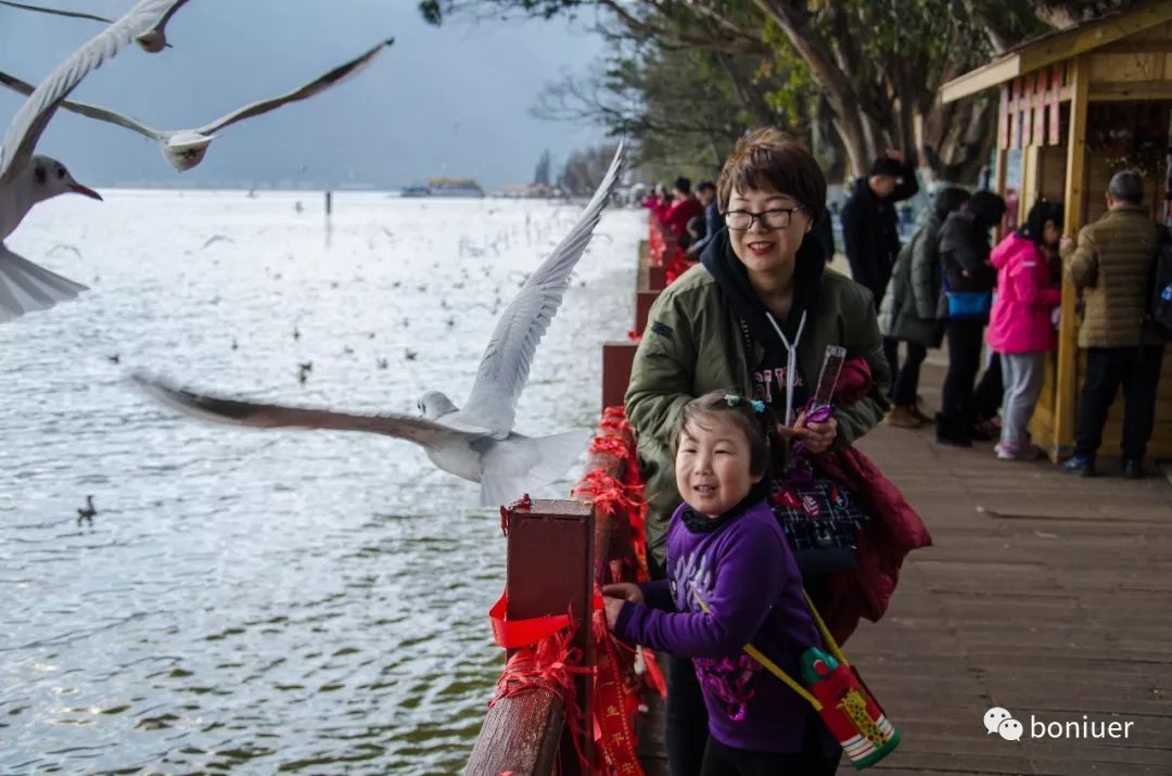 高铁抵达昆明南站时已是午时,匆匆入住酒店吃过午饭后,便开始想着下午该去昆明市区逛一逛,但是由于时间短暂,一时间却又不能拿定注意去哪里最好,好在同行的友人是位有着多年城市规划经验并且多次出差昆明的专业人士,很确定的告诉我们这个时间点还是带着孩子去滇池喂喂红嘴鸥吧,一来大人可以看看著名的风景名胜,二来孩子也肯定喜欢喂喂小鸟与小动物亲密接触一下。就这样,在友人的提示下我们来到了滇池,滇池距离市区不远,不到一个小时的车程,到达时正好是日落时分,风景大美。