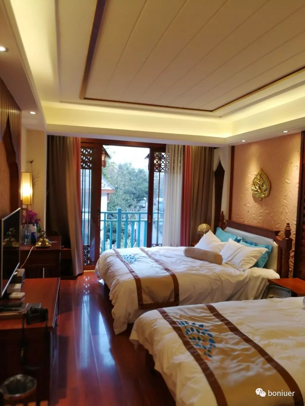此行的第二站就是美丽的西双版纳,入住的客栈距离西双版纳景洪市的大金塔仅有百米之遥,傍晚打开客栈阳台的窗户便望见了在夕阳中金光闪闪的大金塔。