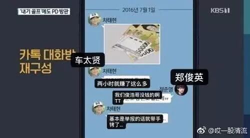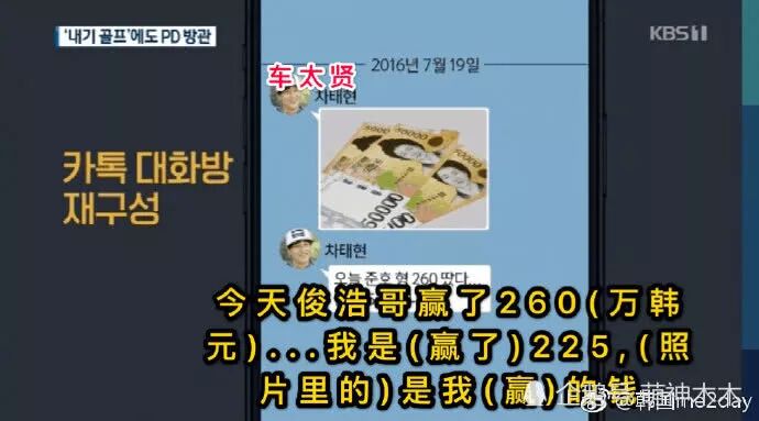 然而这还没有完,3月16日韩媒再次曝出,称在获缴的郑俊英手机中,发现了著名韩综《两天一夜》的聊天群,并在这个群里,发现金俊浩和车太贤在玩高尔夫球赌球的记录,还有人上传了赢得数百万韩元的赌球文字和照片炫耀内容。
