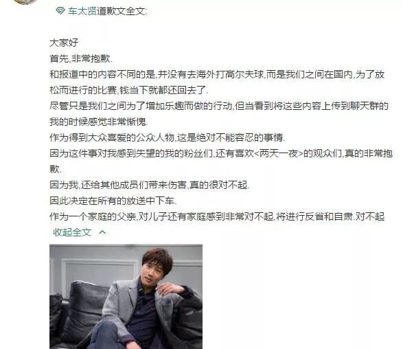 事件发酵之后,车太贤方面也发表了声明,表示赌球只是朋友间的打赌,钱也在结束之后还给了朋友,但是作为公众人物,赌球是绝对不能被容忍的事情,所以深刻道歉,并且从所有节目中退出。
