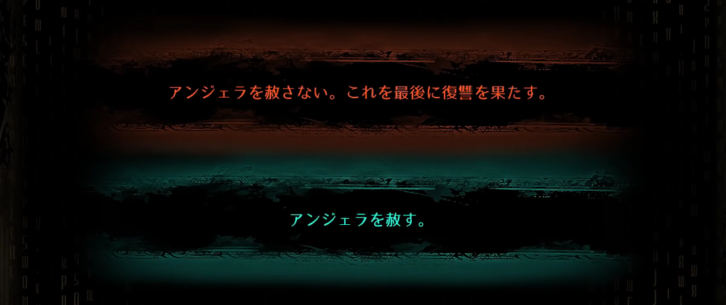 同時に、アンジェラ自身もまたプレイヤーの願いを表象しています。ずばり、この世界は不正に満ちている。しかし、そうした不正を一つずつ解決していこうとしても、また新たな問題がつぎつぎと噴出し、いずれ人々は「どうせ世の中はよくならないんだ」と諦念を抱いてしまいます。アンジェラもまた、作中世界の現実に打ちのめされた女性です。