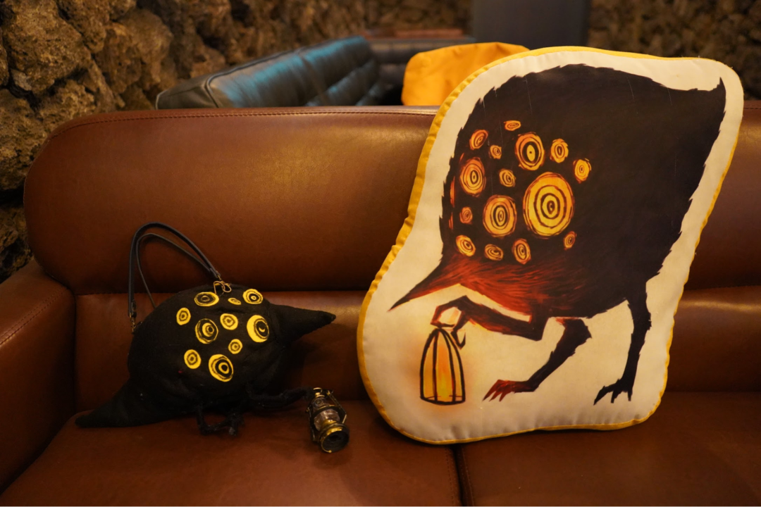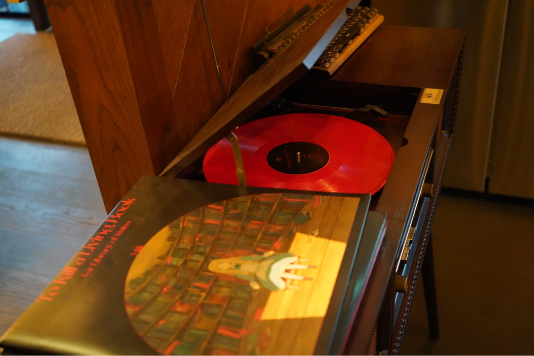 荘厳な図書館をおもわせるシックな木板の壁、天井には車輪などをデコレーションしたあたたかな照明、床には瀟洒な革張りのソファ、そして、本棚には韓国語版の『白鯨』……どこからか、ピアノに乗って幻想的な歌声がながれてくる。見れば、アンティーク調のレコードプレイヤーでレコードがかかっていた。インディーバンドMiliによる『Library of Ruina』の主題歌「String Theocracy」だ。