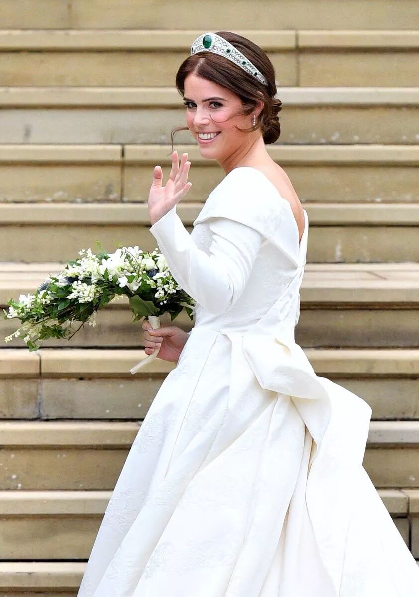 有别于凯特王妃及梅根王妃,尤金妮刻意不戴头纱,礼服后背也做成大V领设计,露出她12岁时接受脊柱侧凸治疗留下的伤疤。