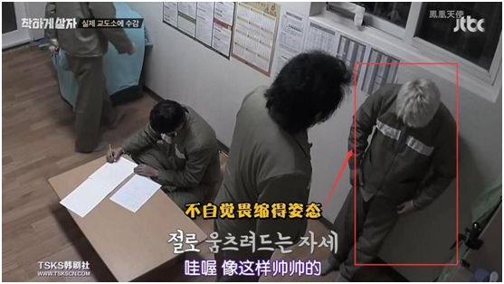 每当与同牢房的明星前辈金甫城交流时,他也总是不自觉地就低头缩起来,