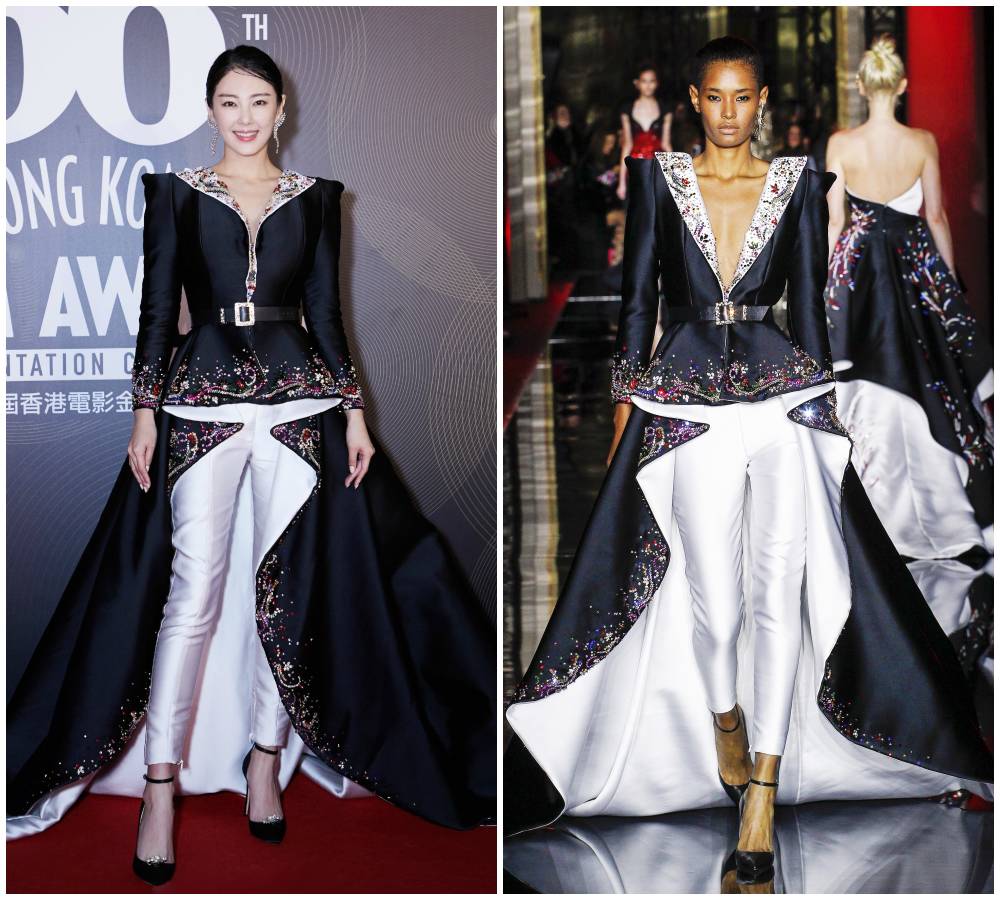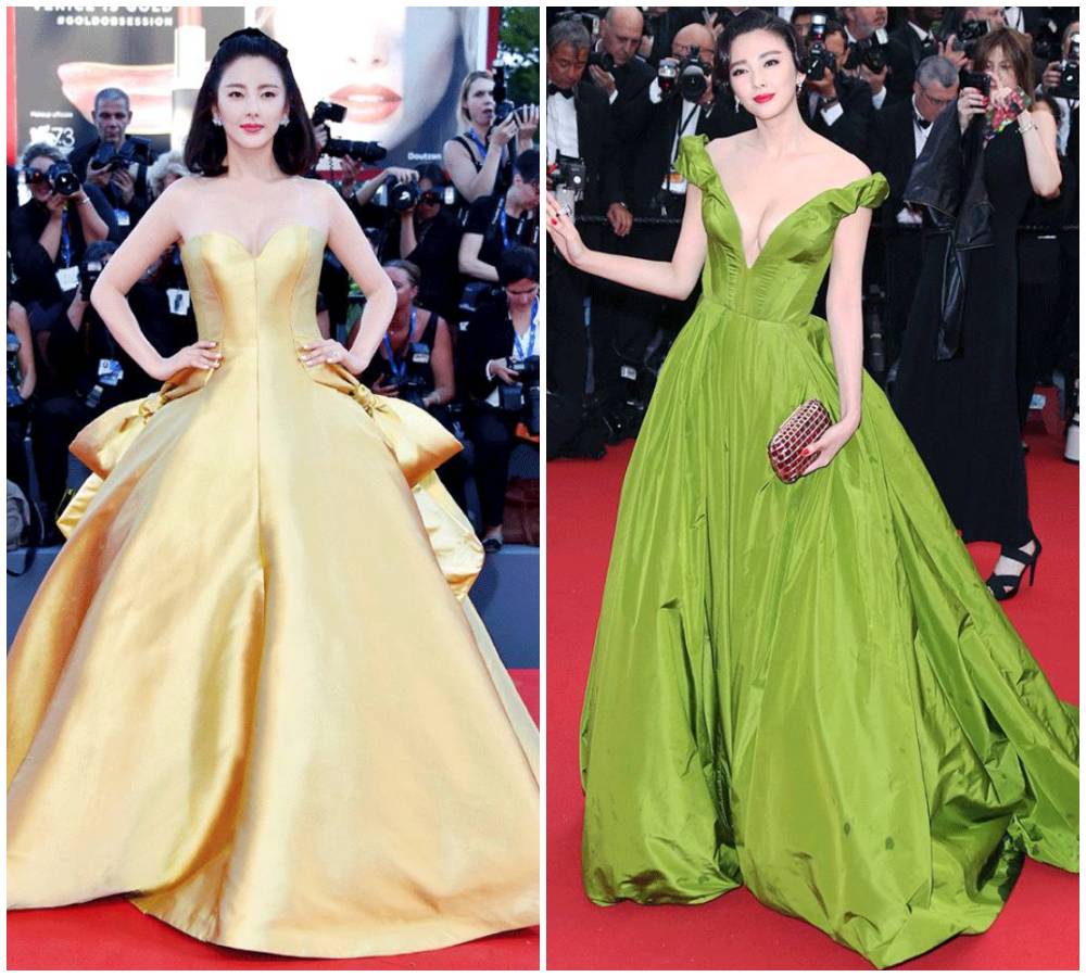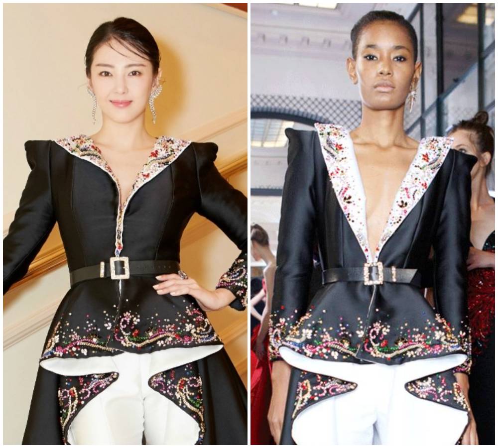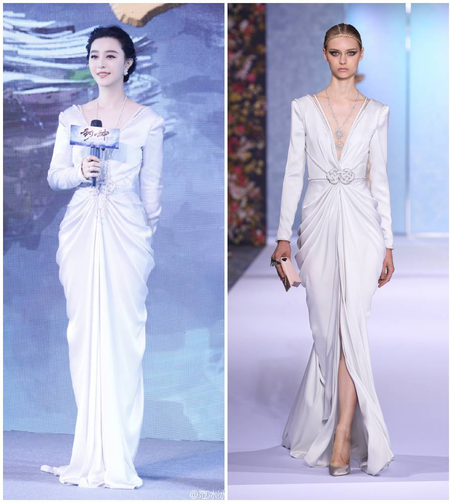 再比如范冰冰这条Ralph & Russo女神裙,修过图看还是不错的,但是看看平胸深V的模特,好像时髦度还是有点减分。