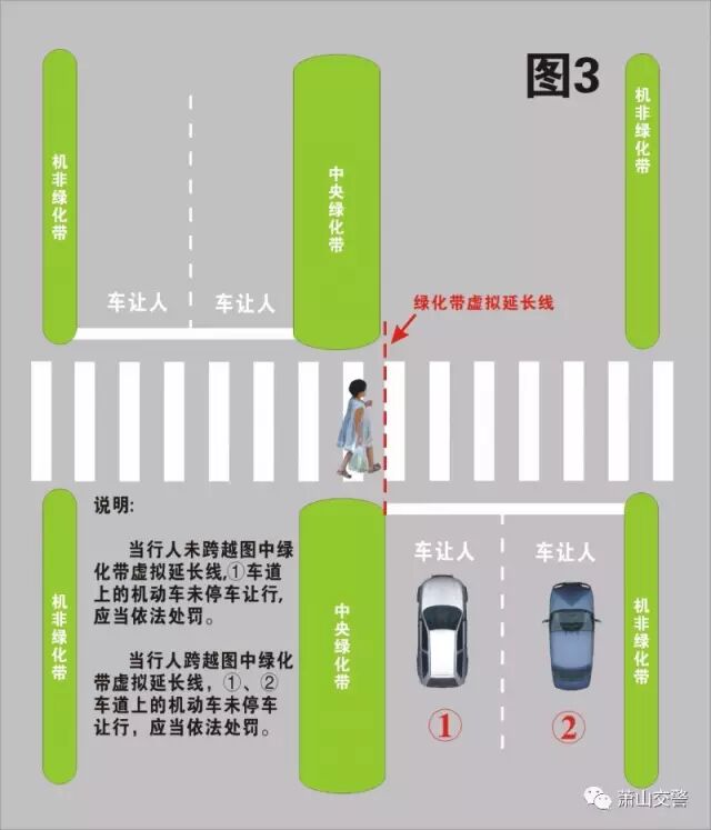 图3为双向四车道,当行人走在斑马线中间段,未跨越图中绿化带虚拟延长线时,如图标识的第①车道上的机动车应停车让行;当行人跨越了图中绿化带虚拟延长线,第①、②车道上的机动车均应停车让行。