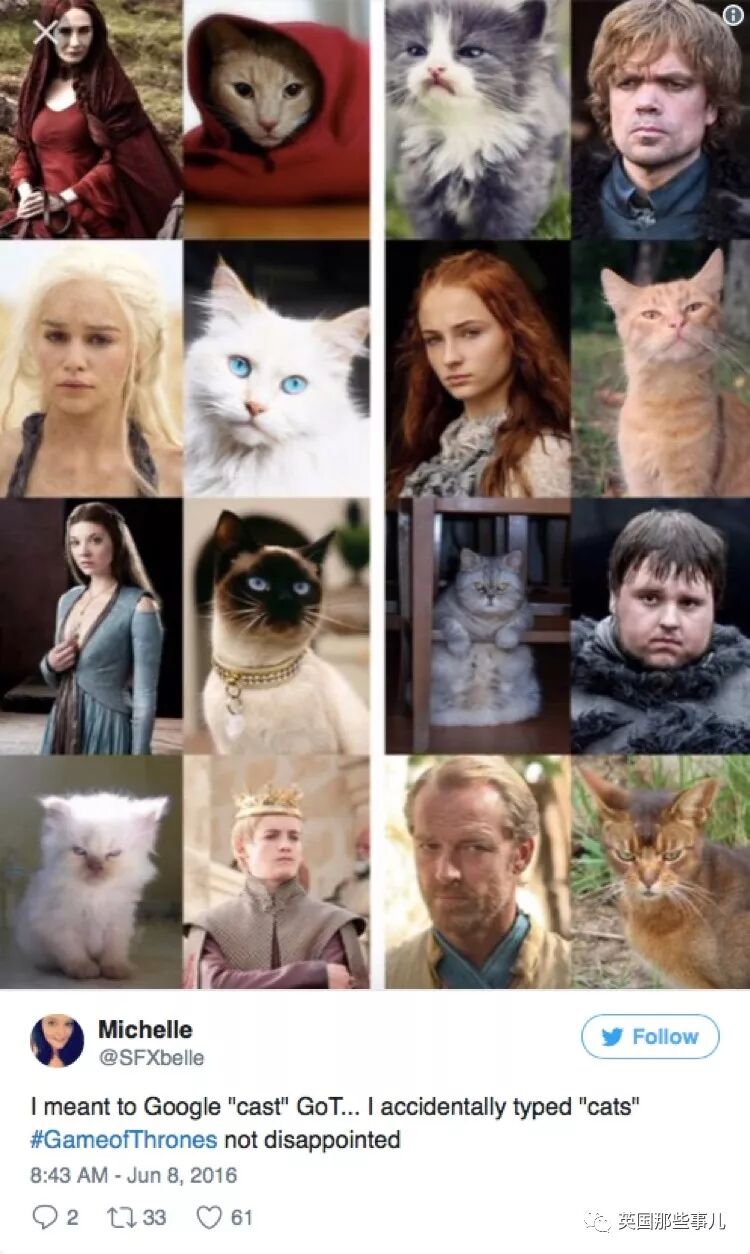 网友12: 我本来是想搜 “cast GoT”(权力的游戏演员表),手误搜成了 “cats GoT” (权力的游戏猫)......