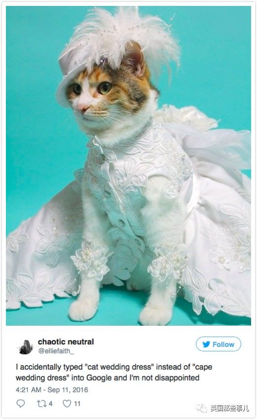 网友10: 我在找“cape wedding dress”(婚纱礼服裙),结果打字打成了 “cat wedding dress”。嗯,你别说还真有......