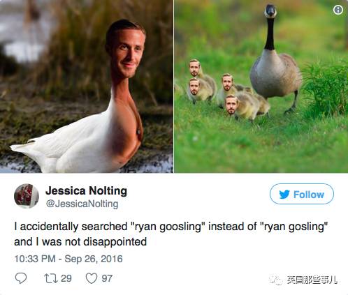 网友6:把 “ryan gosling”(瑞恩 高斯林) 搜成了 “ryan goosling (瑞恩小鹅仔)”,这结果我很满意。